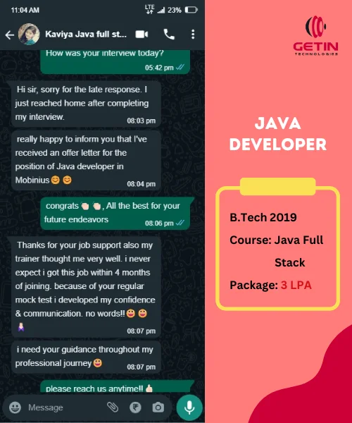 At Getin Technologies in Kovilpatti, Java Fullstack training strengthened my coding foundation, application skills, and confidence through structured learning, mentor guidance, and consistent hands-on practice